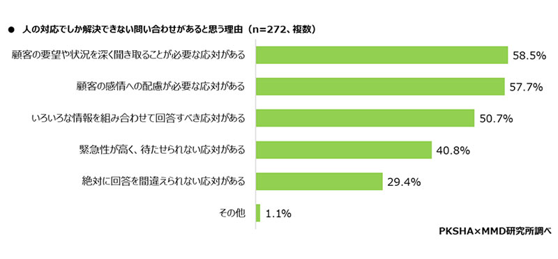 その理由の上位は「顧客の要望や状況を深く聞き取ることが必要な応対がある」「顧客の感情への配慮が必要な応対がある」「いろいろな情報を組み合わせて回答すべき応対がある」といった内容が挙げられた。