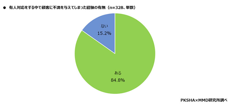 コールセンター従事者328人を対象に、有人対応をする中で顧客に不満を与えてしまった経験の有無を質問。「ある」が84.8%、「ない」が15.2%となった。