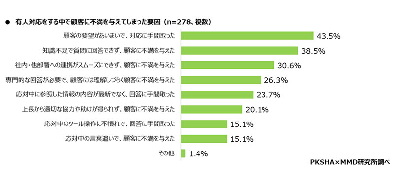 有人対応をする中で顧客に不満を与えてしまった経験がある278人を対象に、その要因を聞いたところ(複数回答可)、「顧客の要望があいまいで、対応に手間取った」が43.5%で最多だった。次に「知識不足で質問に回答できず、顧客に不満を与えた」が38.5%、「社内・他部署への連携がスムーズにできず、顧客に不満を与えた」が30.6%となった。