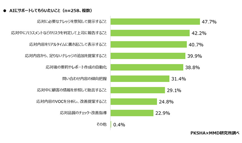 AIにサポートしてもらいたいことを聞いたところ(複数回答可)、「応対に必要なナレッジを察知して提示すること」が47.7%と最も多くなった。