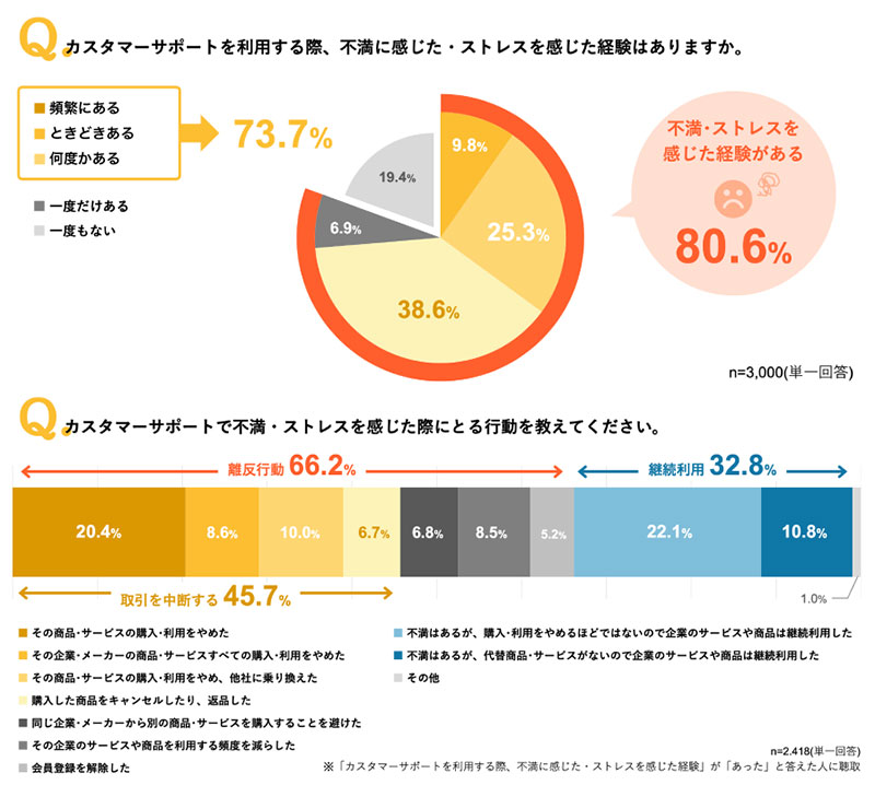 カスタマーサポート利用時に不満・ストレスを感じた経験がある人は、80.6%にのぼった。