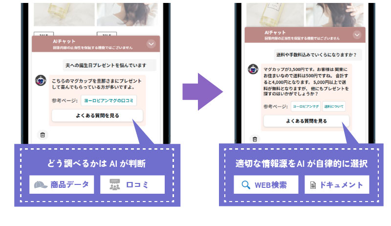 Google Merchant Centerの商品フィード(※1)を「AIデジタルスタッフ」に読み込み商品連携をすることにより、AIエージェントが使える情報が増え、商品の特性、前後の会話の意図・目的を踏まえながら回答できる。