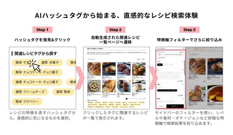 「同じ系統のレシピ」「別の切り口のレシピ」「まだ知らなかった食材の使い方」などへ、ワンクリックでたどれる構造になった。これにより「レシピとレシピ」、「レシピと商品」が有機的につながる体験を実現している。