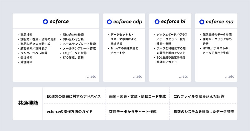 また、「AI活用による業務効率化と意思決定の高度化は、多くのコマース事業者にとって必要不可欠となりつつあります」とも。こうした背景を受けて、コマース事業に特化したAIエージェント「ecforce AI」を開発するに至った。