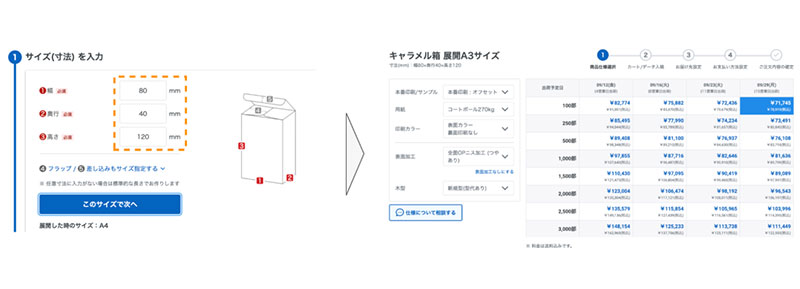 希望の幅・奥行・高さなどを指定すると、箱として製造可能な寸法かを自動判定。納期・ロット別の価格表を、チラシや名刺の注文と同様に瞬時に提示する。