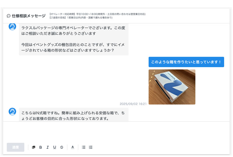 寸法や仕様選択についての相談は常設しているメッセージ機能を使って、パッケージ印刷専門のオペレーターに相談することが可能。