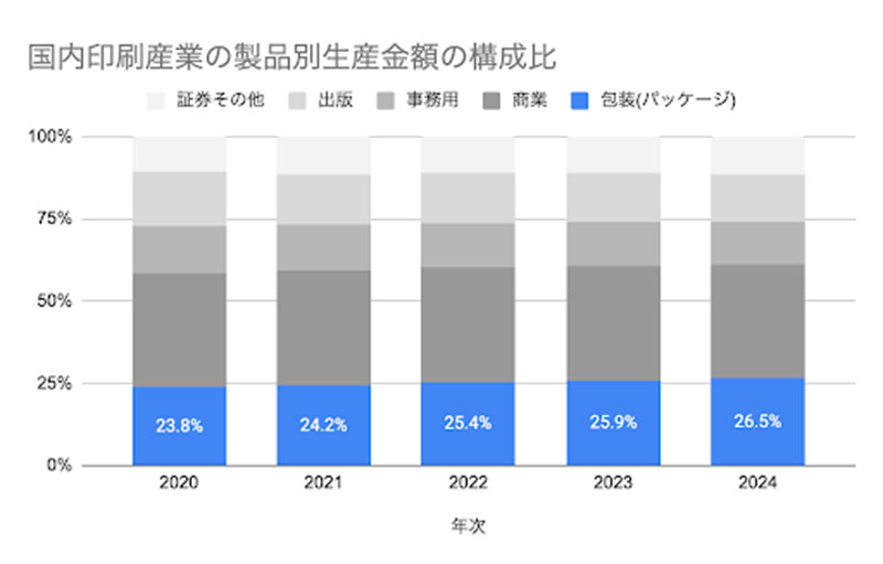 ラクスルの祖業である印刷調達領域の中でも、商品の包装に使われる「パッケージ印刷」は、目を見張る成長を続けている。同社試算によると、市場規模はおよそ1.5兆円程度と、これまでラクスルが手掛けてきた商業印刷や事務用印刷と肩を並べるほど巨大で有望視されているマーケットである。