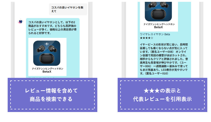 今回発表された「ReviCo連携機能」では、ReviCoが提供するレビューフィードを「AIデジタルスタッフ」に読み込ませレビュー情報を連携。Googleへのレビュー連携用データをそのまま活用することで、シームレスな連携を実現した。これにより、AIエージェントが使える情報が増え、商品の提案時に「レビュー情報を表示した回答」や「商品に寄せられたレビューを要約した回答」が可能なった。