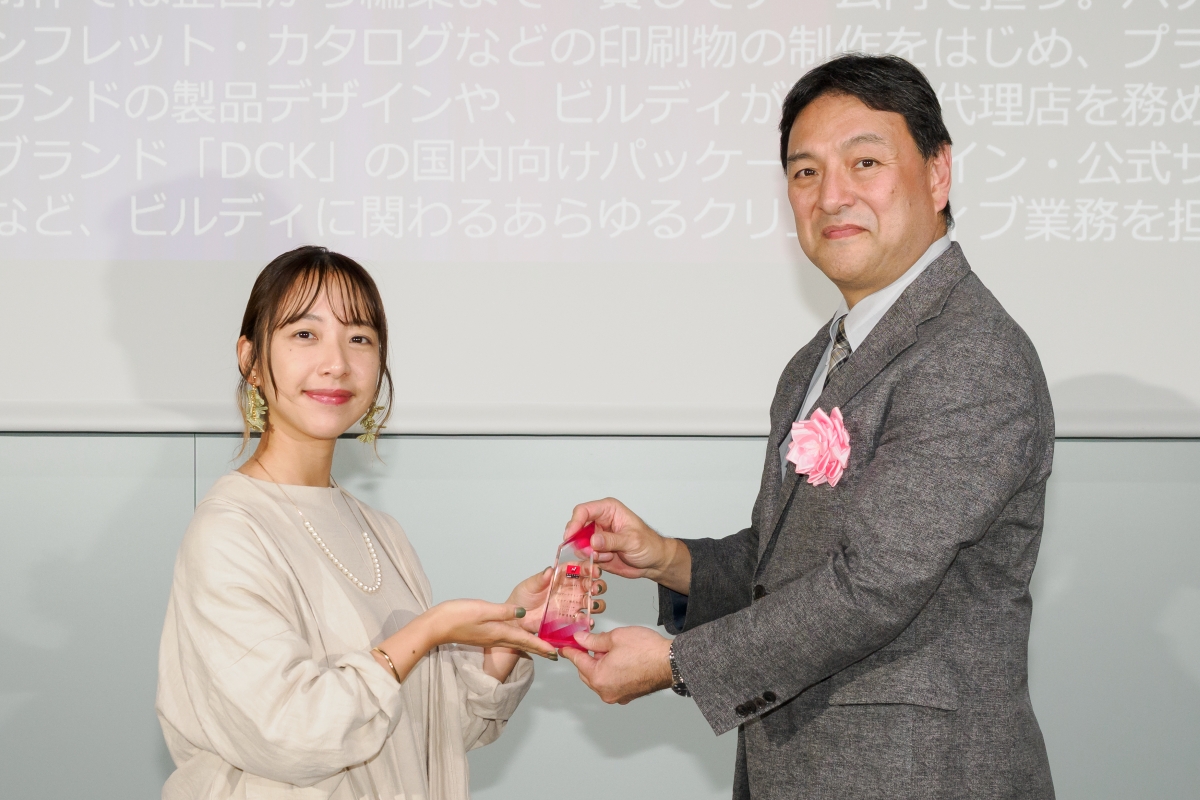 (左から)2022年にビルディにクリエイティブデザイナーとして入社し翌年クリエイティブチームに配属後、SNSの運用担当をスタートさせたビルディ株式会社 コンテンツ部 クリエイティブチーム リーダー 戸田夏海氏と選考委員の逸見光次郎氏