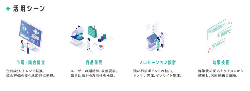 クチコミが投稿された日や投稿者の年齢・職業・性別・肌質タイプなどさまざまな切り口からクチコミの検索が可能。また絞り込んだ膨大なクチコミデータをAIが要約する機能も搭載。これまで手作業で収集・分析していた作業をわずか数秒で実行できる。