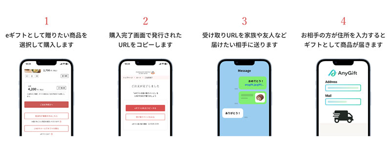 「eギフト」は、贈り先の住所を知らなくても、LINEやメールなどで気軽にギフトを贈ることができるサービスである。