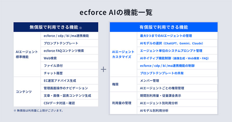 こうした状況を背景に今回、ショップ専用のAIエージェントの構築を可能にする「ecforce AI」の有償版の提供を開始するに至った。