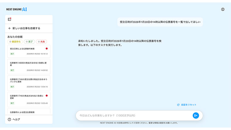 NE株式会社は2026年2月6日、EC事業者へ向けて日常会話で指示するだけで、受注処理などの実務をAIが代行する「NEXT ENGINE AI」を正式リリースした。