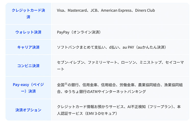 ▷クレジットカード決済(Visa、Mastercard、JCBなど)はもちろん、PayPay(オンライン決済)やキャリア決済、コンビニ決済など、日本の消費者が求める主要なローカル決済を、開発工数をかけずに一括で導入することが可能。