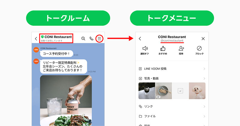 ▷トークルーム右上のメニューボタンから遷移するトークメニュー内に、LINE公式アカウントの「LINE ID」を表示。