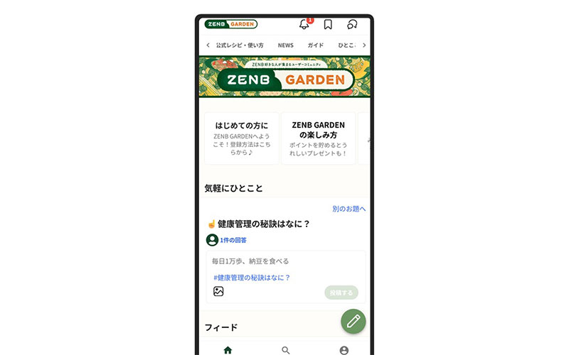 「ZENB GARDEN」はZENBユーザーが集まり、ZENB商品やおいしく、カラダにいい食生活の楽しみ方を共有・交流できるオンラインコミュニティ。コミューン株式会社が提供する、相互交流で信頼を育む「Commune(コミューン)」にて運用される。