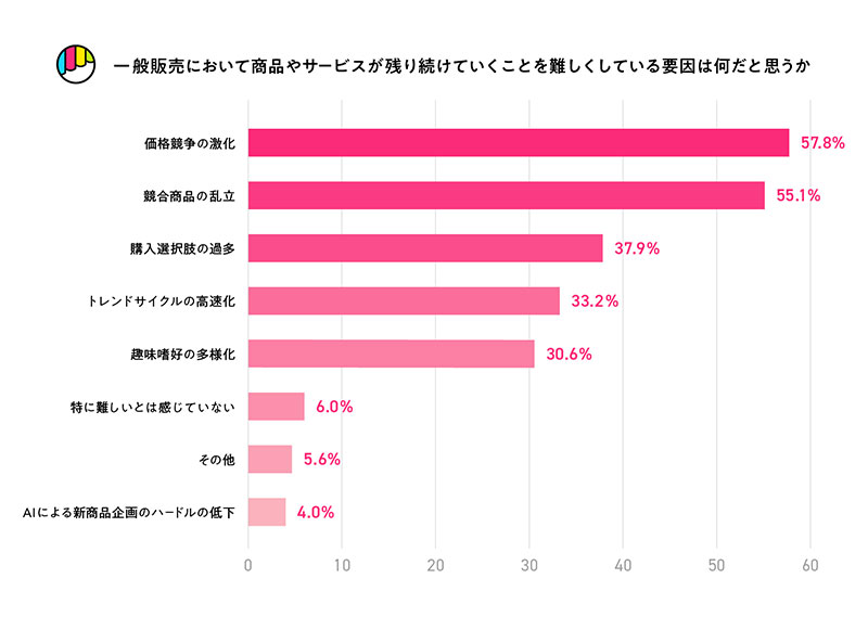 その中で、商品が一般市場で生き残ることを難しくする要因として「競合商品の乱立」や「価格競争」が上位に。次いで「購入選択肢の過多」「トレンドサイクルの高速化」などが挙がっている。