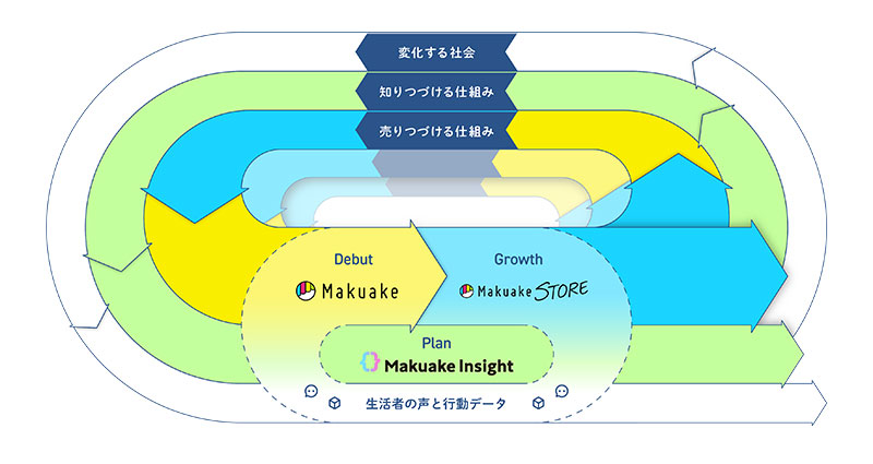 マクアケは、新商品デビューの場としての「Makuake」と、拡販の場としての「Makuake STORE」、そして生活者の声と行動データを知ることができる「Makuakeインサイト」を併せ持つプラットフォーム。