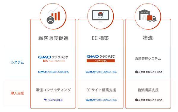 GMOシステムコンサルティング株式会社(代表取締役社長:寺島 俊樹)は、三井倉庫ロジスティクス株式会社(代表取締役社長:鳥井 宏)、株式会社シナブル(代表取締役社長:小林 裕紀)との協業により、中規模以上のECサイト構築から物流・販促までのサポートをセットにした「GMOクラウドEC パッケージEC」の「バリューセット」の提供を開始したと発表した。