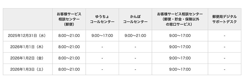 2025年12月30日から2026年1月3日までの対応は、以下の図表の通り。なお、郵便局デジタルサポートデスクについては、2025年12月26日までの受付となる。