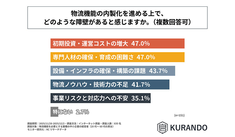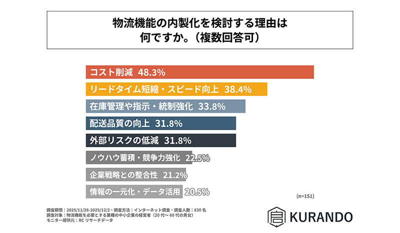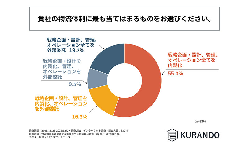 株式会社KURANDOは2025年12月16日、「物流機能内製化への意識と障壁に関する調査」の結果を公表した。