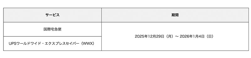 年末年始期間における通関業務の休業等により国際宅急便、UPSワールドワイド・エクスプレスセイバー(WWX)のお届けに遅れが生じる可能性がある。