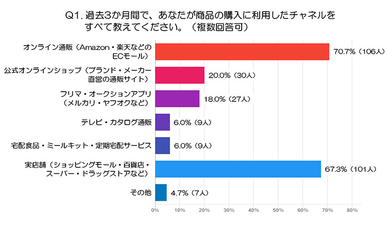 「過去3カ月間で、あなたが商品の購入に利用したチャネルを教えてください(複数回答可)」と質問。7割以上が「オンライン通販(Amazon・楽天などのECモール)」と回答した。