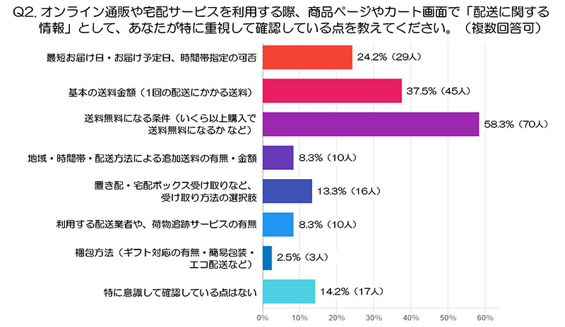 先の質問で「オンライン系チャネルを1つ以上選んだ人」を対象に、「配送に関する情報で重視している点」をヒアリングした。その結果、半数以上が「送料が無料になる条件(いくら以上購入で送料無料になるかなど)」と回答した。
