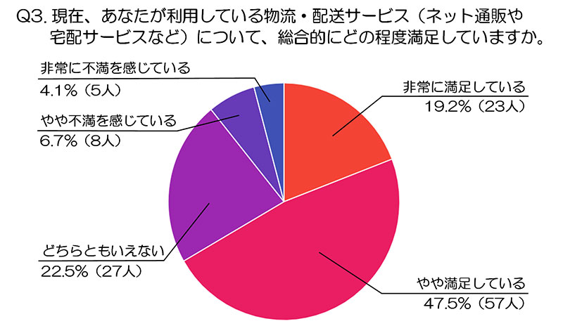 続いて「現在、あなたが利用している物流・配送サービス(ネット通販や宅配サービスなど)について、総合的にどの程度満足していますか」と質問。「やや満足している」が最も多い割合を占めた。
