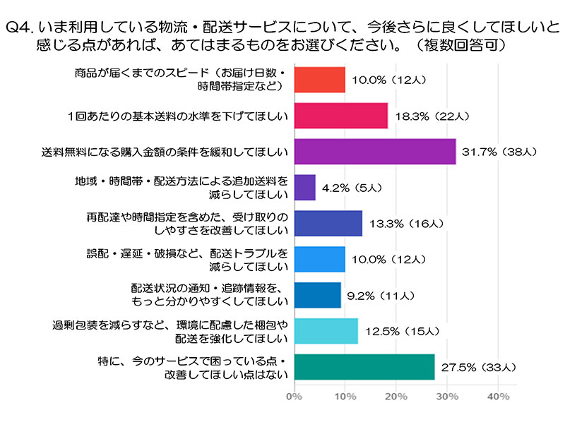 さらに「いま利用している物流・配送サービスについて、今後さらに良くしてほしいと感じる点があれば、あてはまるものをお選びください」と質問。「送料が無料になる購入金額の条件を緩和してほしい」が3割以上と、最も多くなった。