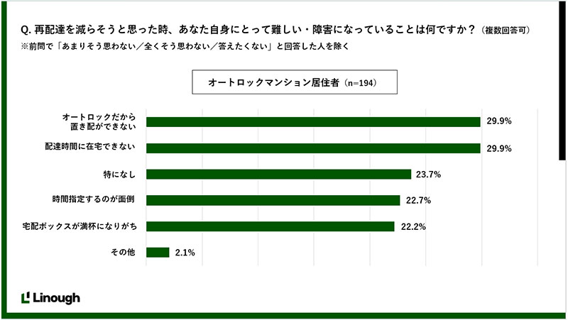 配送業界の課題解決に協力意向を持つオートロックマンションの居住者に、再配達を減らすための障害を調査。その結果、「オートロックがあるため置き配ができない」と「配達時間に在宅できない」が最も多い回答となった。