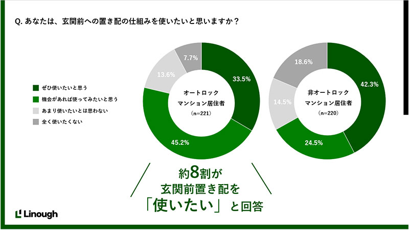 「玄関前への置き配の仕組みを使いたいと思いますか?」という質問に対しては、オートロックマンションでは約8割が「玄関前置き配」を使いたいと回答。非オートロックマンション居住者の、置き配利用意向を上回る傾向が確認された。