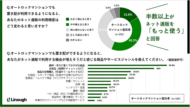 オートロックマンションで置き配が利用可能になった場合、「ネット通販の利用頻度が増加する」と回答した人は半数以上を占めた。