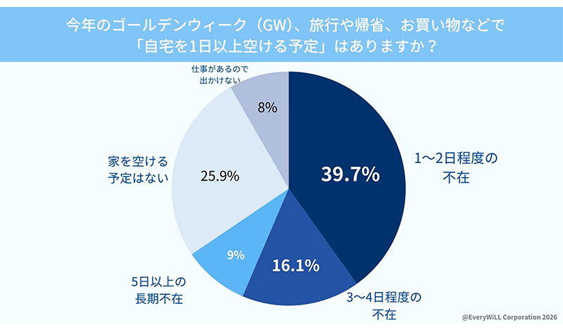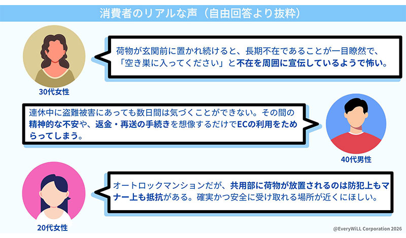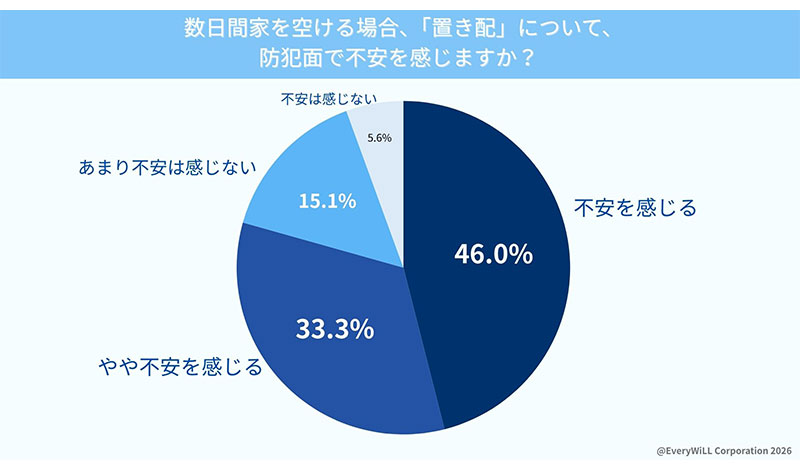この結果についてEveryWiLLは「荷物の放置が『長期不在のサイン』となり、空き巣などの防犯リスクを高めることへの強い抵抗感が示されています」とコメントしている。