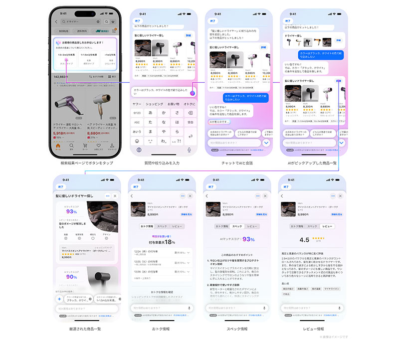提示された商品を選択すると、ユーザーのニーズとのマッチ度を示す「AIマッチスコア」が表示される。加えて、商品の概要やおトクに買い物できる日、レビューの要約、他商品との比較情報も確認できる。商品名やカテゴリに詳しくないユーザーでも、日常のニーズやシチュエーションを会話形式で伝えるだけで、希望に合った商品にたどり着けることが期待される。
