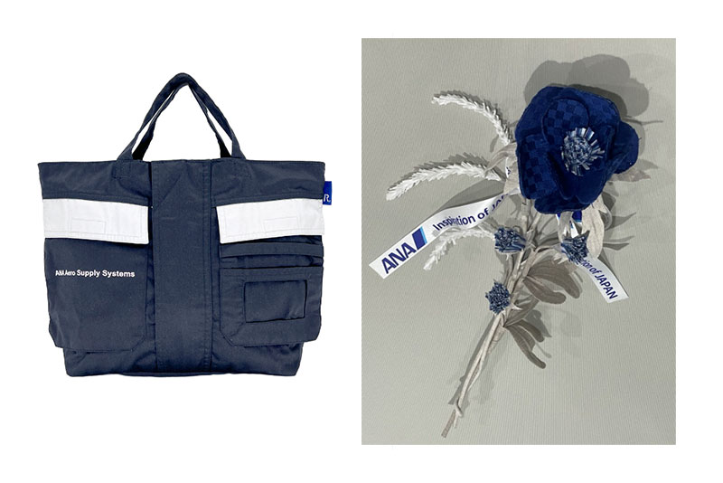 現在、発売を控えているのは、限定カラーのANA特製アップサイクルバッグとアップサイクルフラワー。今回のバッグはこれまでのサックスブルーから、限定色のネイビー基調のカラー。秋冬シーズンにぴったりの、シックなカラーリングとなっている。フラワーはテキスタイルフラワーの「Lovéco」とコラボレーション。ANA由来の素材とファッション業界由来の素材を組み合わせた、ハイブリッドなアップサイクルフラワーをANAロゴのリボンでデコレーションしている。