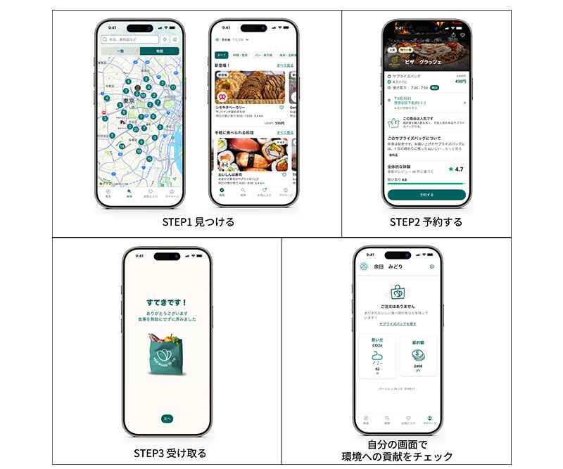 ユーザーはアプリ上で現在地やエリアから対象店舗を探し、「サプライズバッグ」を予約。指定された引き取り時間に店舗へ行き、スマートフォンの画面を提示すると、商品をスムーズに受け取ることができる。