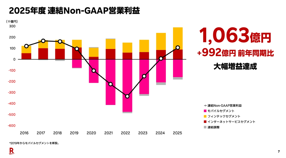 2026年2月12日、楽天グループが2025年度通期決算を発表した。連結売上収益は前年同期比9.5%増の2.5兆円、Non-GAAP営業利益は1063億円となり、増収増益で着地した。国内EC事業では売上収益が1兆円を突破している。今後は、モバイルとのシナジー拡大やAI活用による継続的な収益成長を目指すという。
