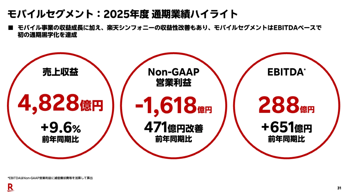 シナジーの要となるモバイル事業は、楽天モバイル全契約回線数が1001万回線を突破。また、通期EBITDA黒字化を達成した。これはモバイルセグメントとして初めてのことだ。2026年には楽天モバイルユーザーに対して楽天銀行の金利を上乗せするプランを開始したり、動画配信サービスと抱き合わせのキャンペーンを行ったりして誘致を進め、さらにモバイルユーザーの増加を狙う。