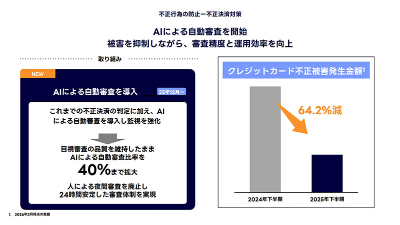 また、「Yahoo!ショッピング」では2025年12月より、不正決済対策の一環としてAIによる自動審査を開始。従来の不正判定やEMV 3-Dセキュアなどの対策に加え、AIを活用した審査を導入することで監視体制を強化している。