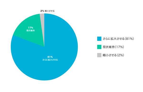 「今後のEC事業への投資の見込み」について聞くと、「さらに拡大させる」との回答が8割を超え、「現状維持」の17%を大きく上回る結果となった。