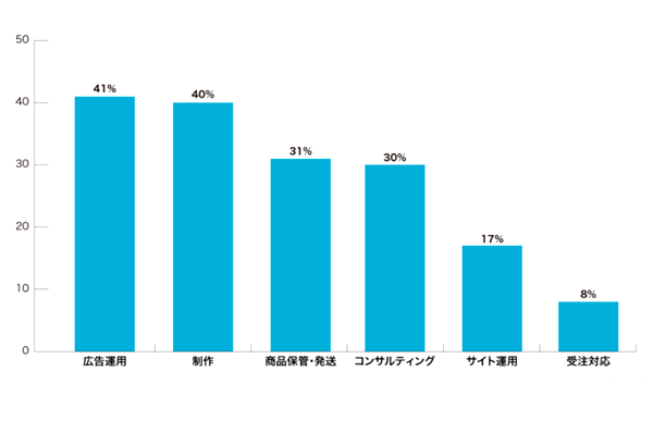 「外部に委託している、または過去に委託していた業務(※複数選択可)」について聞くと、広告運用や制作が各4割を占めた。それに、商品保管・発送、コンサルティングが約3割で続いた。