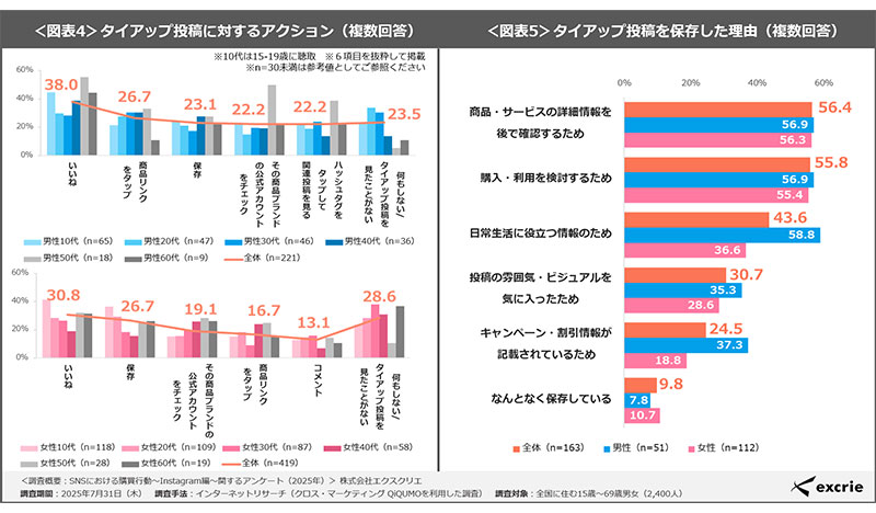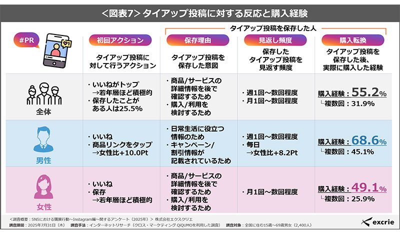 エクスクリエは、タイアップ投稿に対するアクションや保存したタイアップ投稿へのその後の行動を、以下の図表のように整理している。