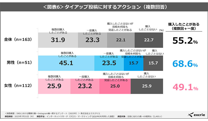保存したタイアップ投稿の商品を実際に購入した経験がある人は55.2%と、半数を超えた。特に男性は購買経験者の割合が68.6%と女性より高く、男性の購買行動の活発さが際立つ結果となった。