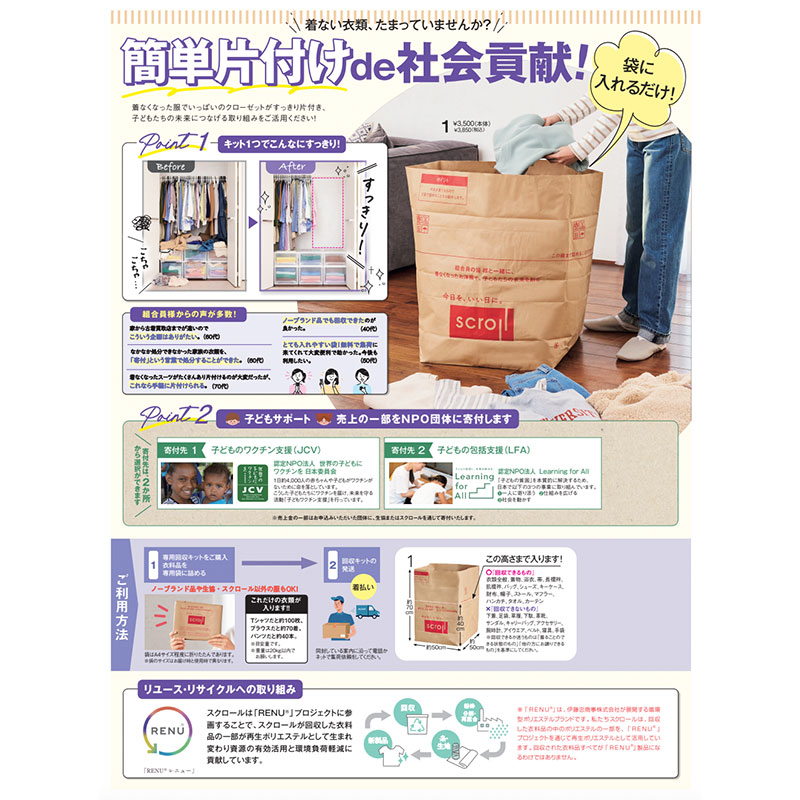 また、社会貢献の一環として衣料品回収キットの売上の一部は、子どもたちの未来を創るための活動を行う社会貢献団体に寄付される。