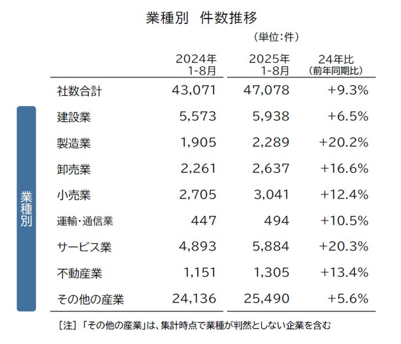 2025年1〜8月に全国で休業・廃業、解散を行った企業(個人事業主を含む、以下「休廃業」)は4万7078件。前年同期(4万3071件)を9.3%上回り、3年連続で増加した。