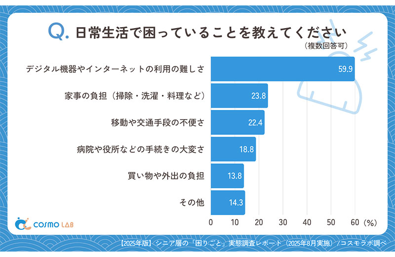 「日常生活で困っていることを教えてください」と質問したところ、「デジタル機器やインターネットの利用の難しさ」(59.9%)という回答が突出して高い割合となった。次いで「家事の負担(掃除・洗濯・料理など)」(23.8%)や、「移動や交通手段の不便さ」(22.4%)、「病院や役所などの手続きの大変さ」(18.8%)が挙がった。