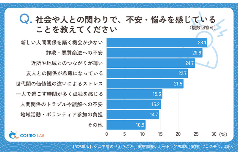 続いて「社会や人との関わりで、不安・悩みを感じていることを教えてください」と質問。「新しい人間関係を築く機会が少ない」(28.1%)や、「詐欺・悪質商法への不安」(26.8%)、「近所や地域とのつながりが薄い」(24.7%)、「友人との関係が希薄になっている」(22.7%)がほぼ同水準で上位を占めた。