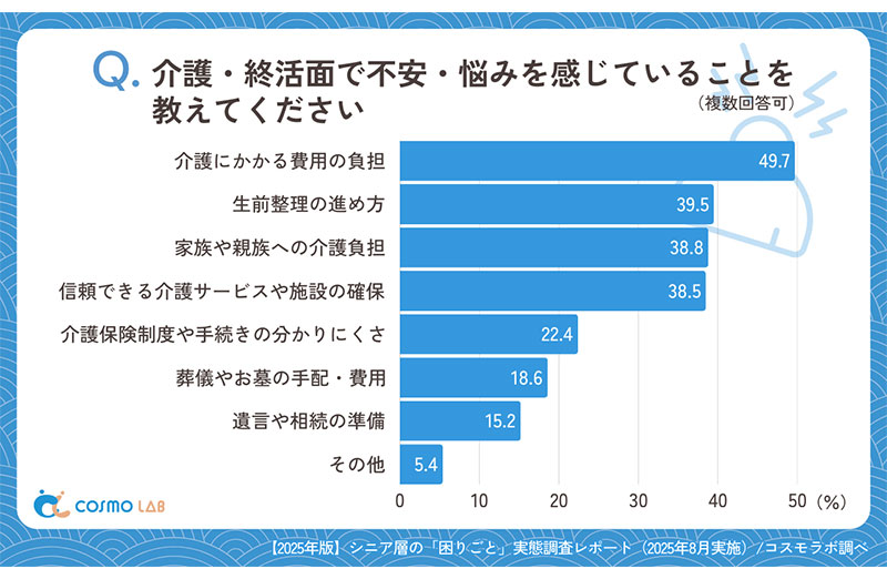 「介護・終活面で不安・悩みを感じていることを教えてください」という質問では、「介護にかかる費用の負担」(49.7%)が最多となった。