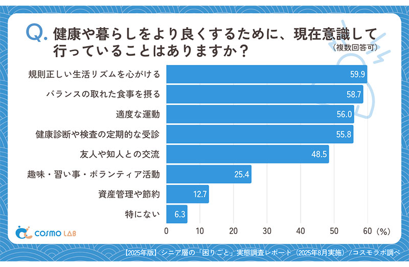 「健康や暮らしをより良くするために、現在意識して行っていることはありますか」という質問には、次の回答が挙がった。「規則正しい生活リズムを心がける」(59.9%)が最多で、「バランスの取れた食事を摂る」(58.7%)、「適度な運動」(56.0%)、「健康診断や検査の定期的な受診」(55.8%)がいずれも5割を超えている。